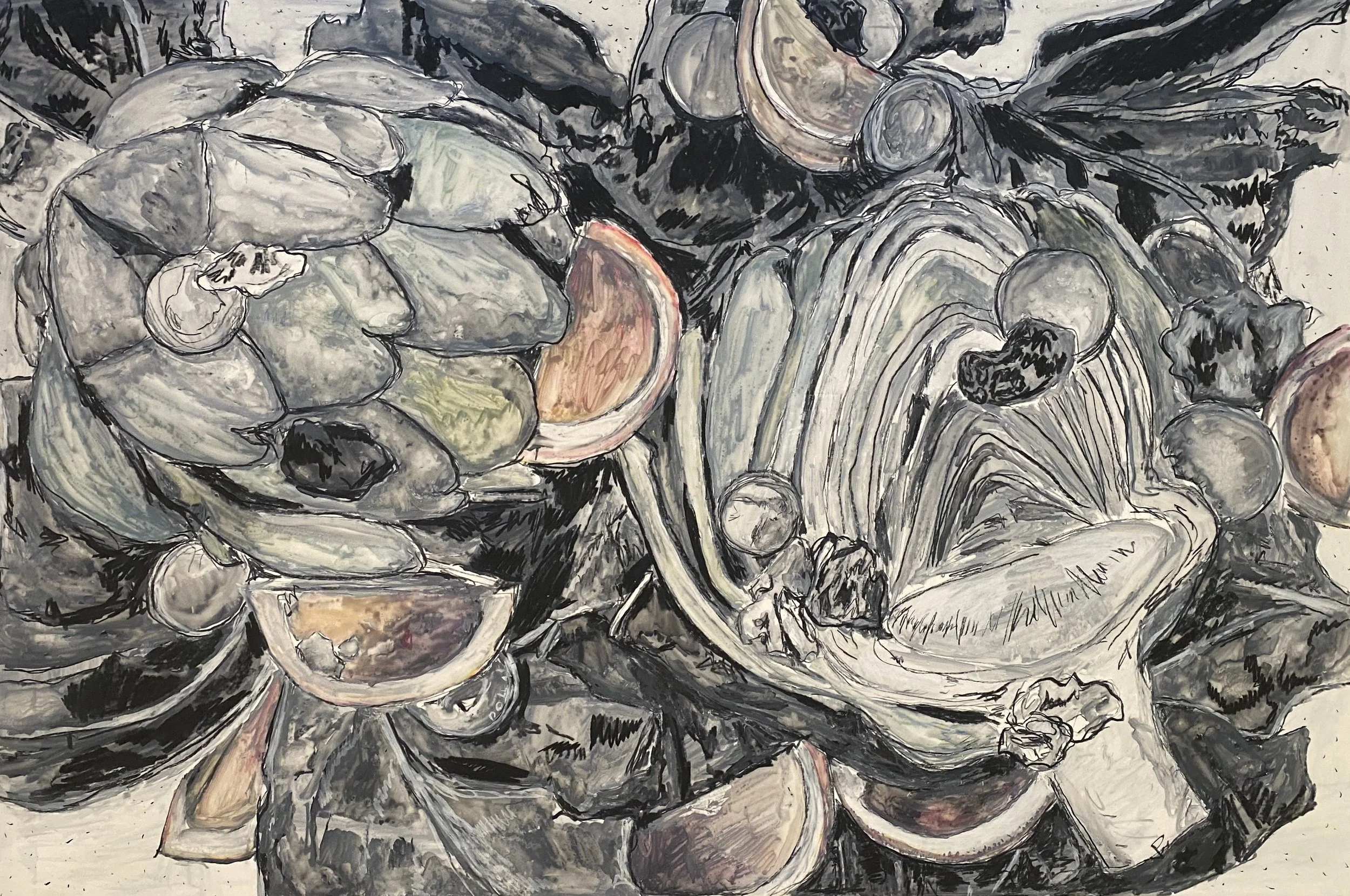I created a harvest still life and replicated it to my best ability at the time, with ink and water. The artwork features pumpkins, tomatoes, corn, leaves and blossoms.